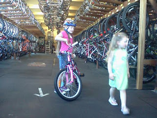 We decided we were going to get Abby a new bike for her up-coming 7 th birthday, so we took a trip to River City Bikes. They were wonderful! She got to try out the bikes on their indoor track and the sales guys was veeerrry patient. After watching how much fun she was having, I decided to use my birthday money (thanks to Bill and Art & Clare!) and buy myself a new bike as well. I haven't had a brand new bike since I was 10! Let's not talk about how long ago that was. Here are pictures of Abby and Libby trying out the bikes at River City and a picture of the bikes Abby and I got.